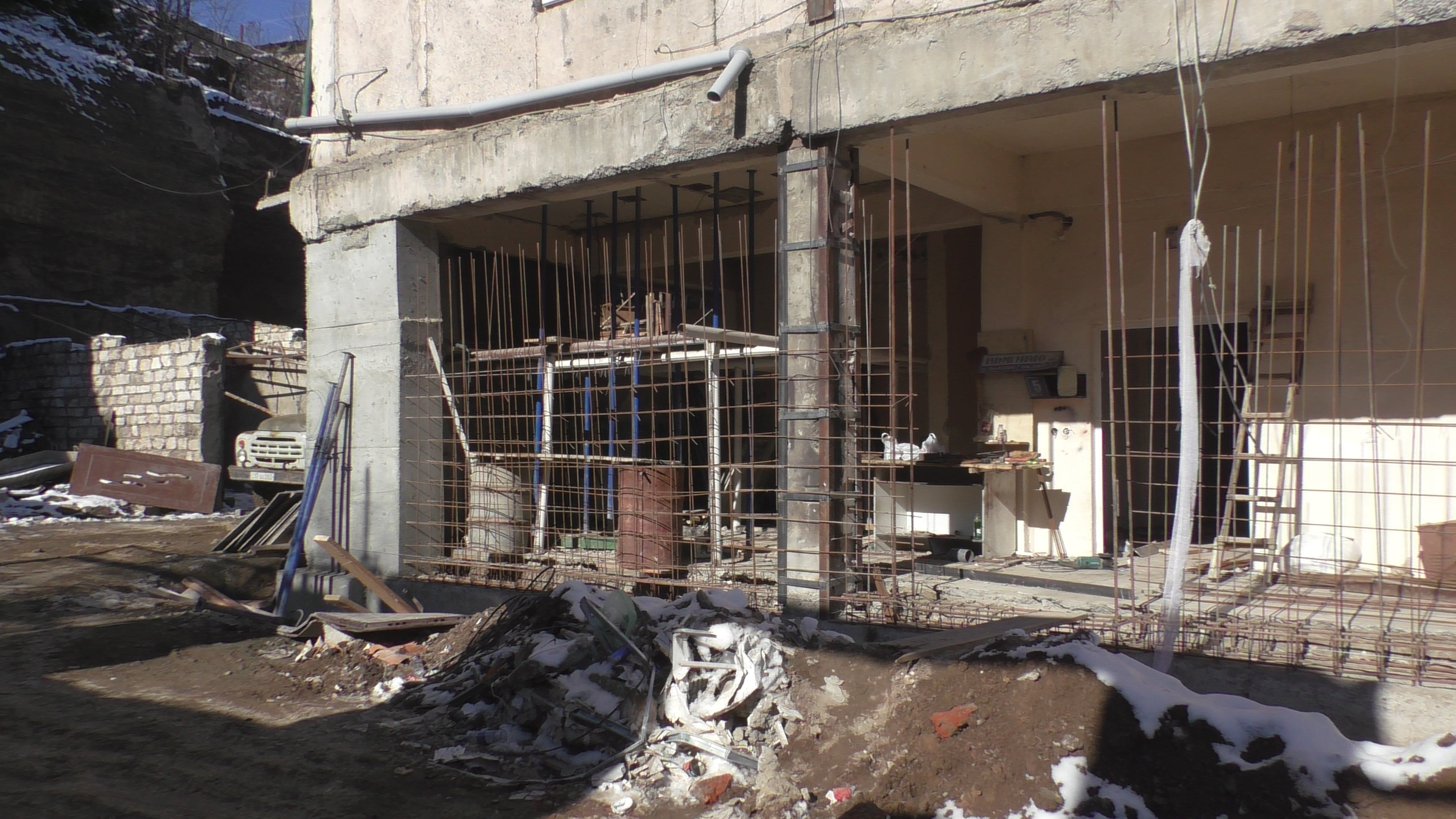 Сын Артура занят постройкой гаража во дворе, но для этого приходится выгрызать у горы свой участок. Верхнюю часть горы выдолбил вручную, перфоратором, туда ковш не дотягивается, а вот внизу помогает юркая техника. И такие есть люди, не сидят и плачут, а живут, работают и строят, даже сейчас...