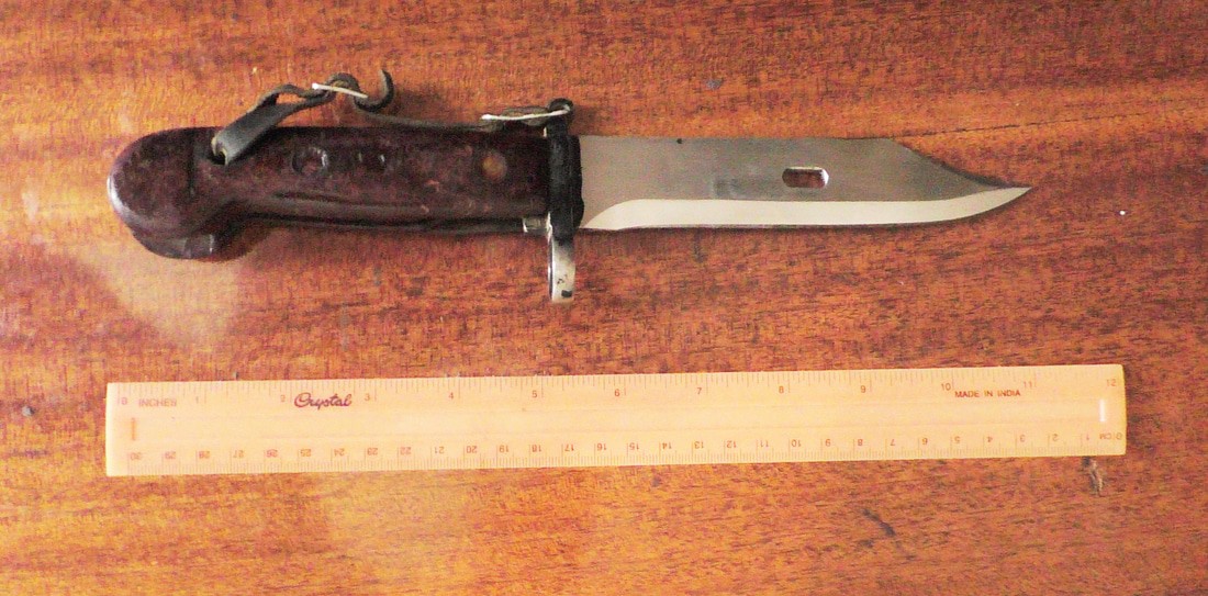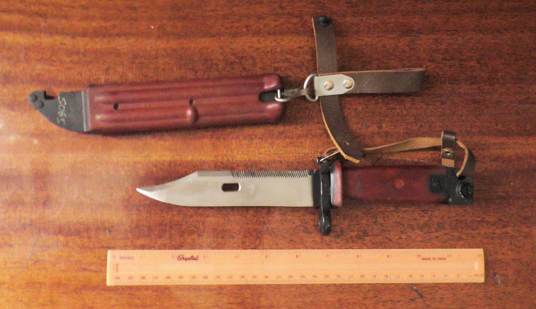 Китайский штык-нож из моей коллекции (он без герба на ножнах), тоже стреляет, но по своему. На ножнах складывающаяся рогатка: собирай на нее резину и стреляй камушками. Если вся китайская армия по разу в тебя стрельнет из рогатки, станет не до шуток, может гора образоваться. Но этот штык-нож, оказывается, не армейски, а полицейский.