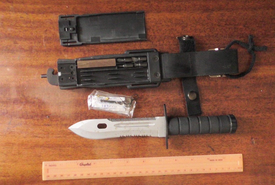 На ножнах уместилась не только рогатка, но и шестигранник, а также пенал. Открываешь, там разные отвертки и камень для заточки. Китайский штык-нож тоже складывается в кусачку, а вот набалдажник рукоятки не молоток, а на резьбе, снимаешь - под ним победитовый штырь для разбития стекол. В специальном кармашке набор выживания: иголка, нитка, леска с рыболовным крючком и скальпель.