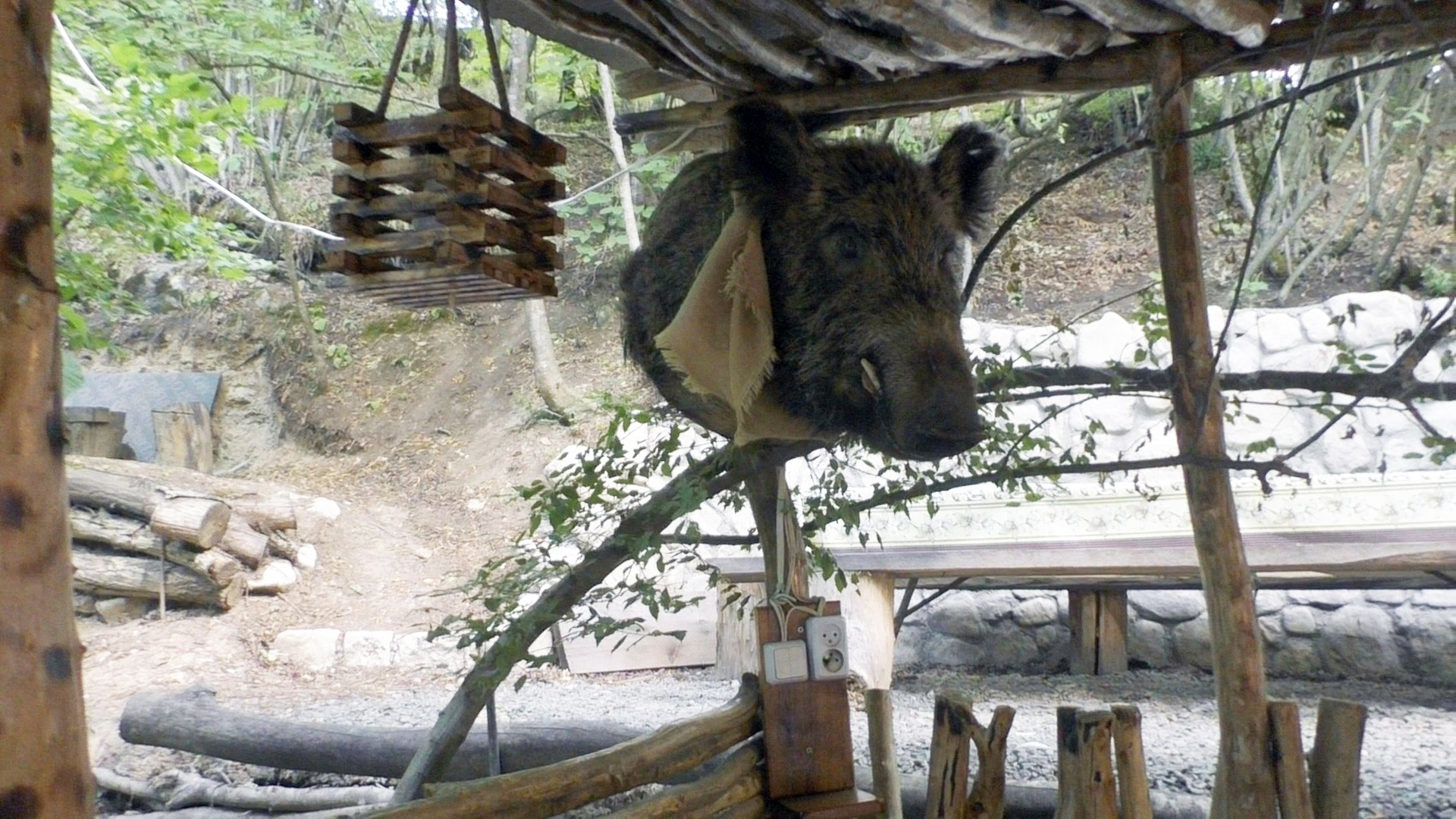 Уютная беседка, из очищенных от коры веток деревьев, построенная с фантазией и никакого постороннего шума, только шум ручья и лесные звуки