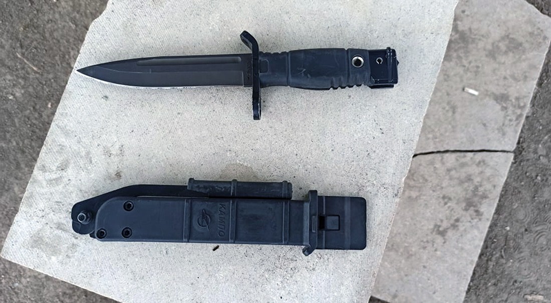 Около монастыря увидел БТР с российскими миротворцами, Амарас снова оказался на нейтрально полосе, потому и охраняют. Подошел к отдыхающим солдатам, говорят все спокойно. Меня заинтересовал их штык-нож нового образца.