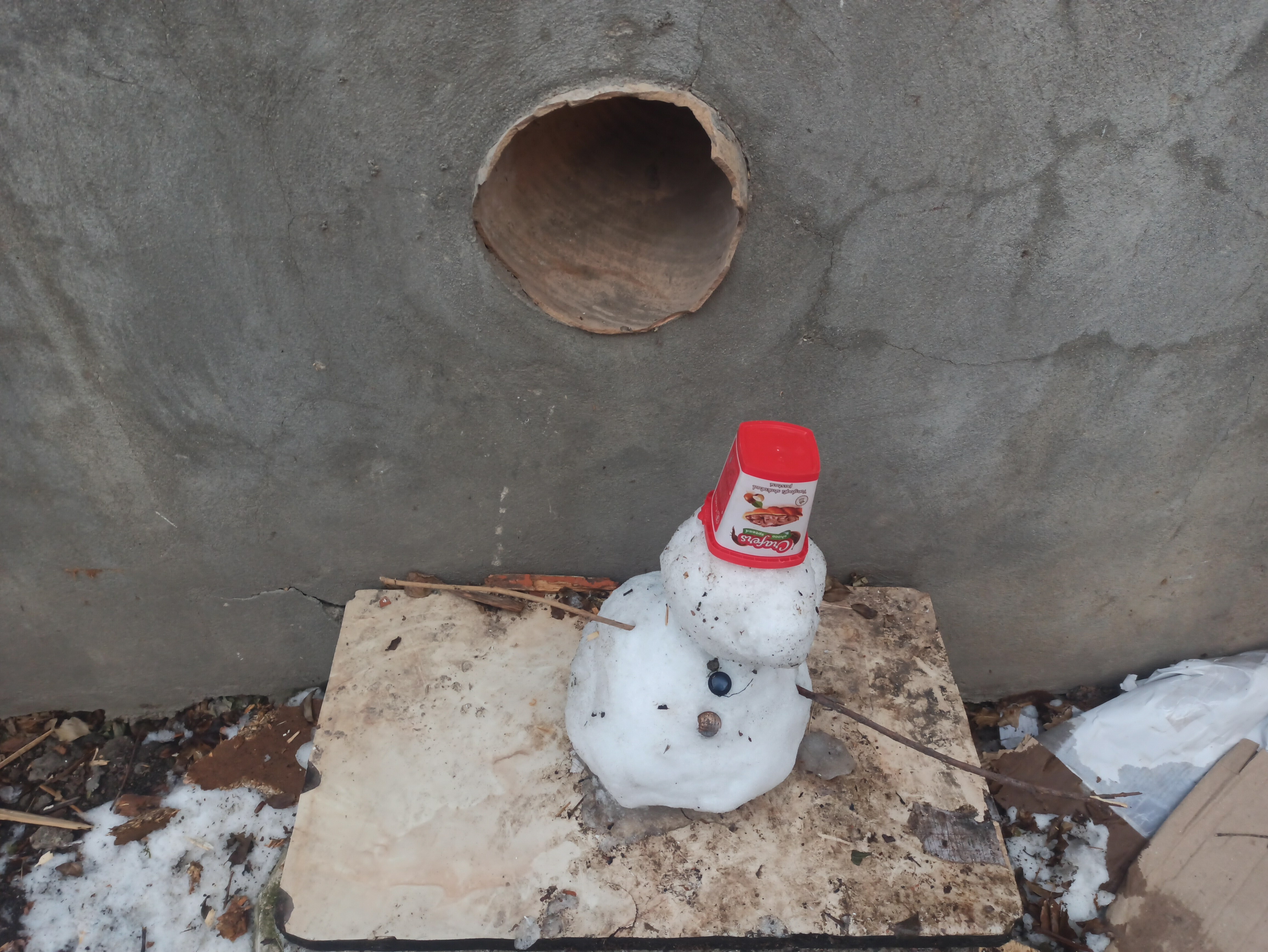 Из этого кувшина родник в стене сделал, сломали сразу, кто не знаю и не хочу узнавать. Снеговика дети позавчера слепили, голова растаяла, вот шапка и сползла на глаза. Корона так обычно правителям глаза закрывает...