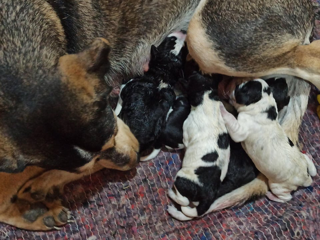 С раннего утра писк дома, Ведьма, так зовут мою собаку, пятерых щенят родила. Как задышали, так и пищат. Ведьма всю ночь металась с дома на улицу, у нее такое впервые, молодец, нормально родила.