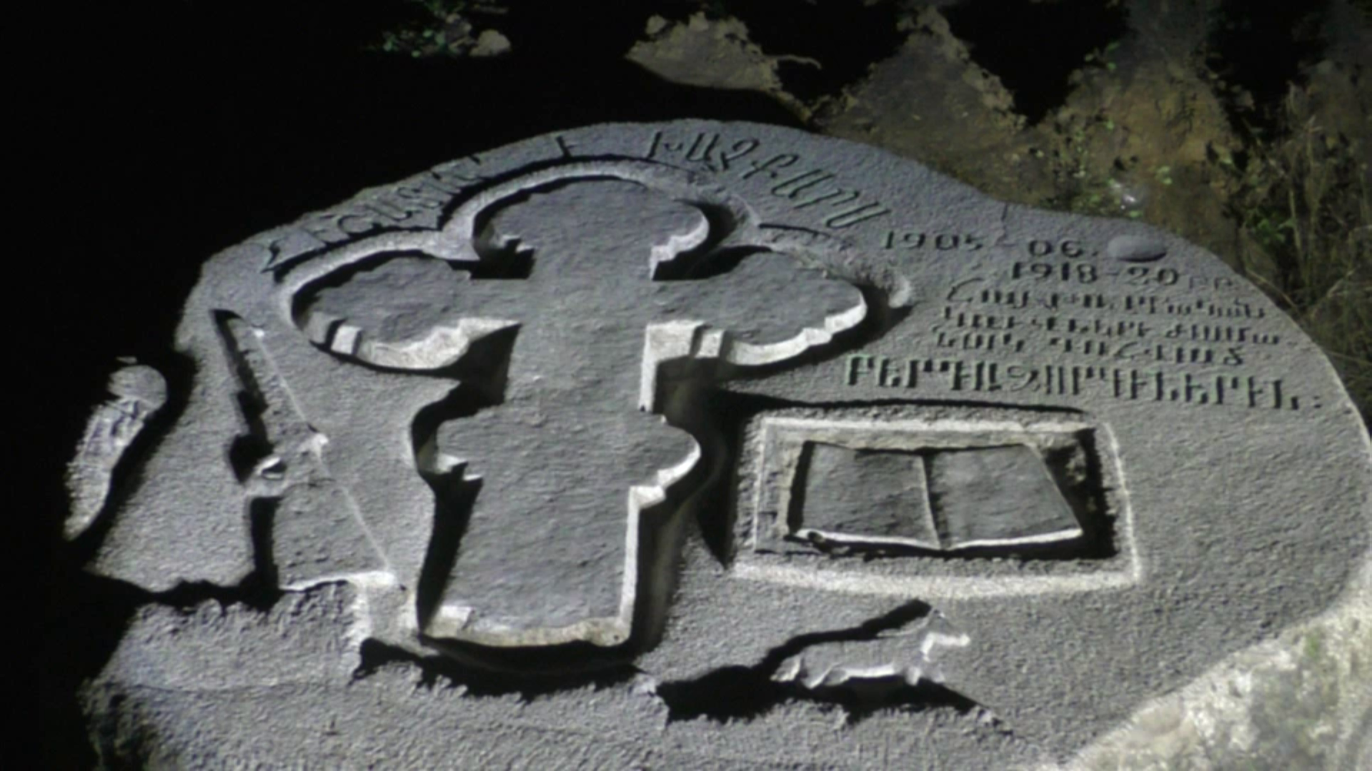 Азербайджанцы обвязали Хачкар ремнем и отодвинули на противоположную сторону.
