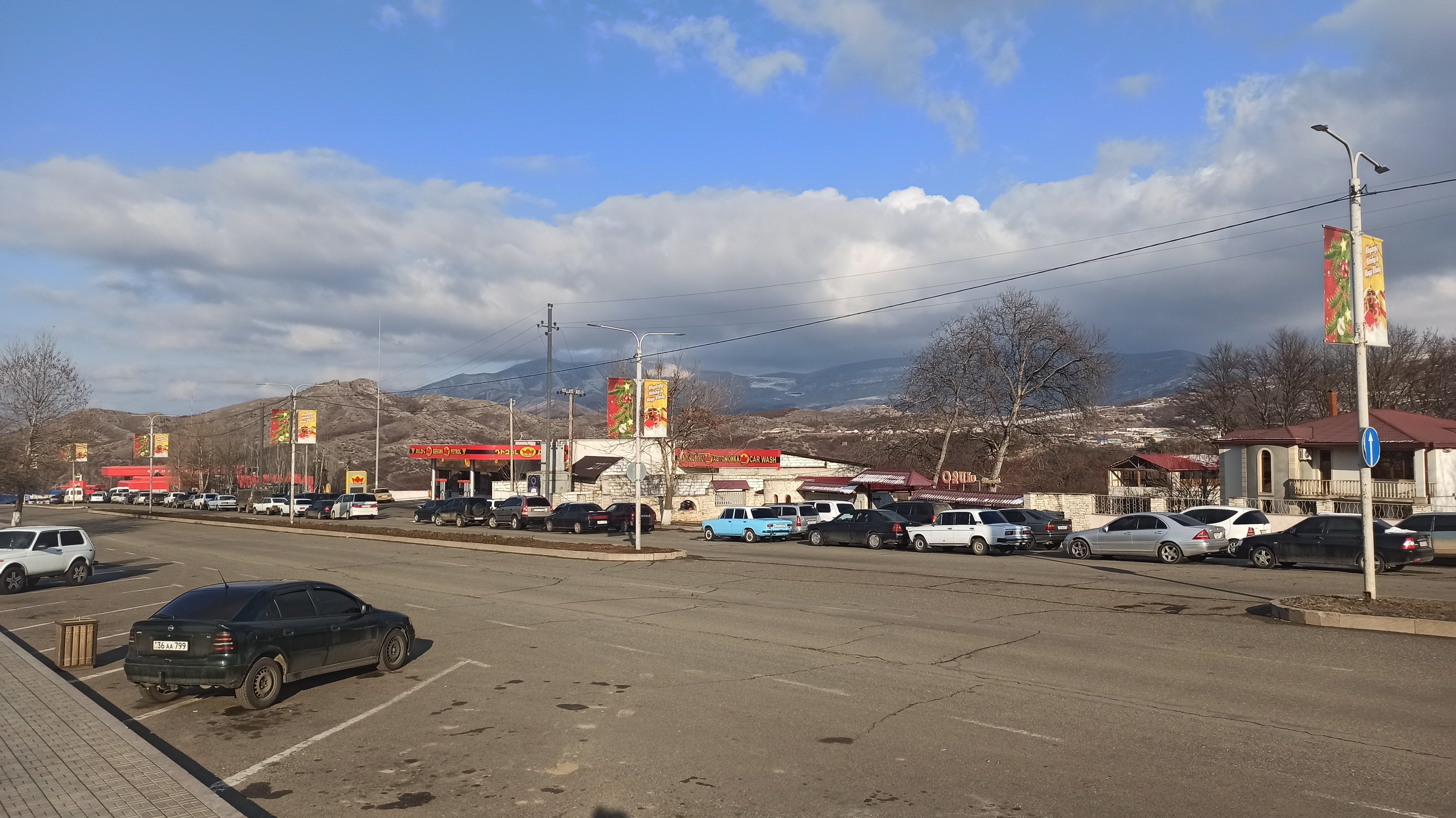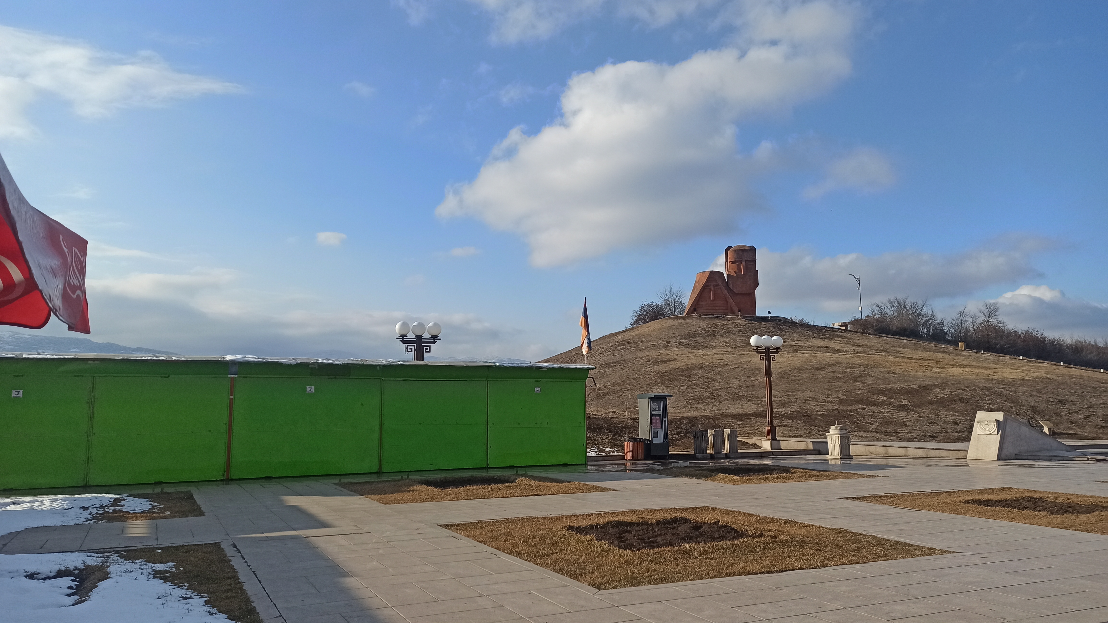 Чуть ниже памятника построили газозаправку, сейчас по дороге к памятнику выстроилась очередь из машин. Газа нет, но очередь есть, люди оставили машины и ушли. Все равно без горючего машинам нет ходу, зато когда подадут газ, они уже в очереди.