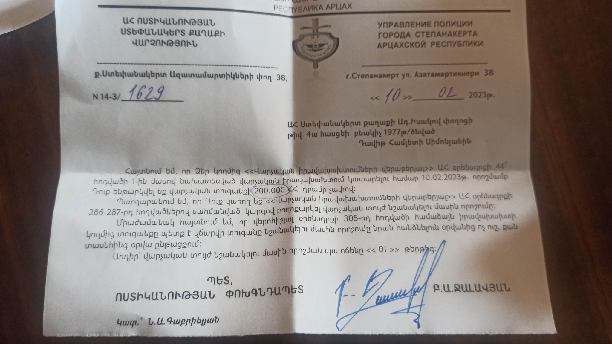 Получил по почте извещение из управления полиции г. Степанакерта о том, что меня оштрафовали на 200 000 драм (506 долл) из-за административного правонарушения. Еще меня известили о том, что штраф надо заплатить в течении 15 суток.
