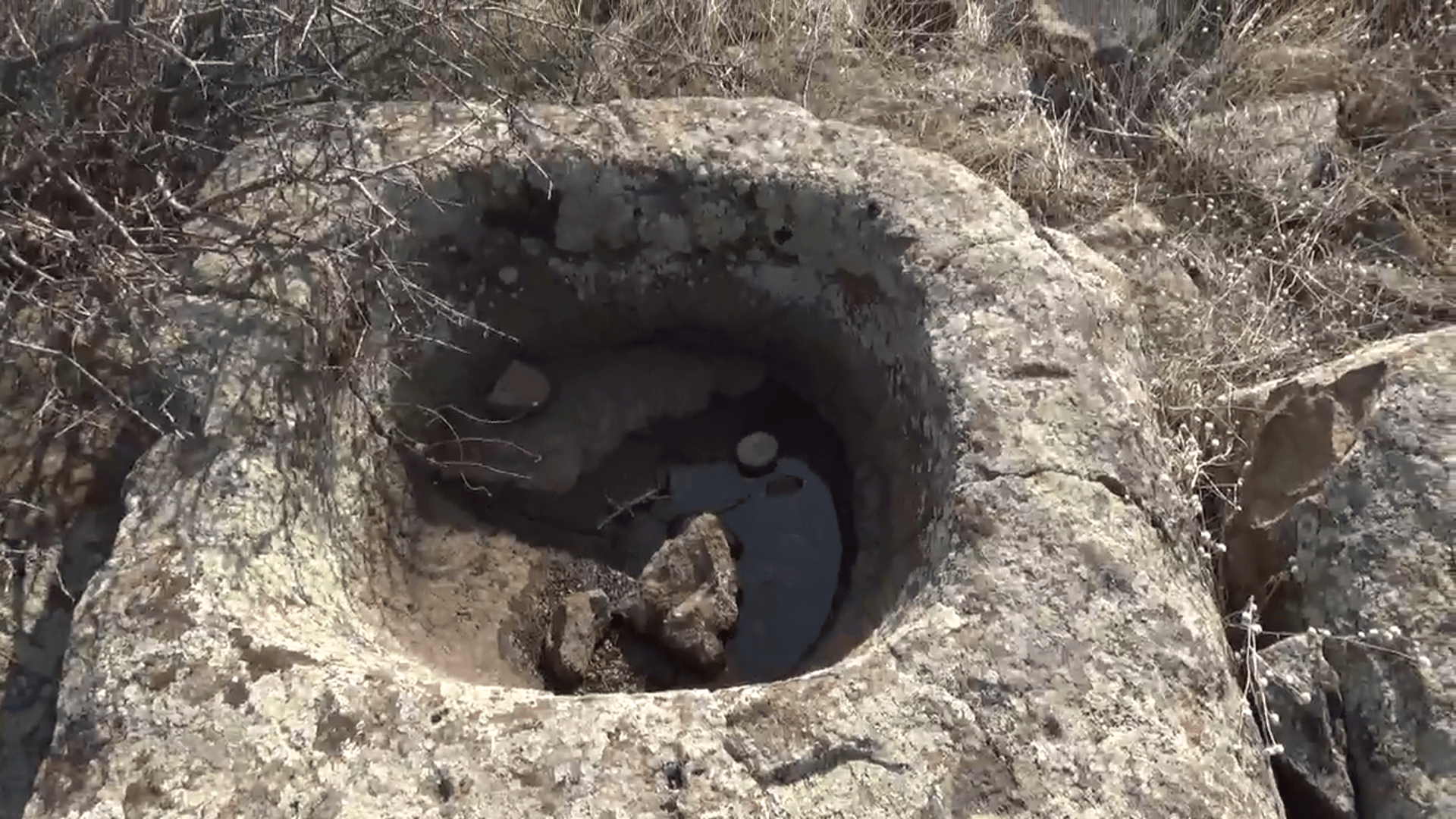 Видны и большие культовые жертвенные алтари, с чашевидными углублениями, в которых сейчас собралась дождевая вода, а в древности, так видимо не вода собиралась, а кровь принесенных в жертву животных.