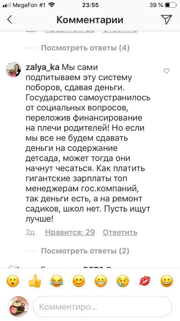 «Замалчивать такое точно нельзя! Не перестаю удивляться нашему народу. Врачи требуют с больных – молчим, учителя требуют, молчим, в детских садах вымогают – молчим и т.д. От этого ситуация только хуже и хуже становится. Нужно озвучивать фамилии и обращаться в прокуратуру, только так можно побороть эту коррумпированность во всех местах».