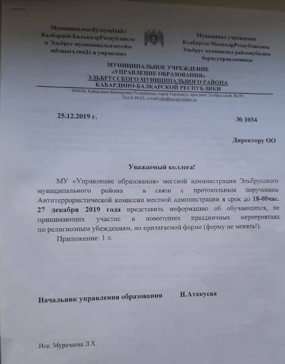 В сети разгорелись нешуточные страсти по поводу письма начальника Управления образования Эльбрусского района, адресованное директорам школ о предоставлении информации на детей, не принимающих участия в новогодних мероприятиях по религиозным убеждениям. Необходимость этого объясняется «протокольным поручением Антитеррористической комиссии».