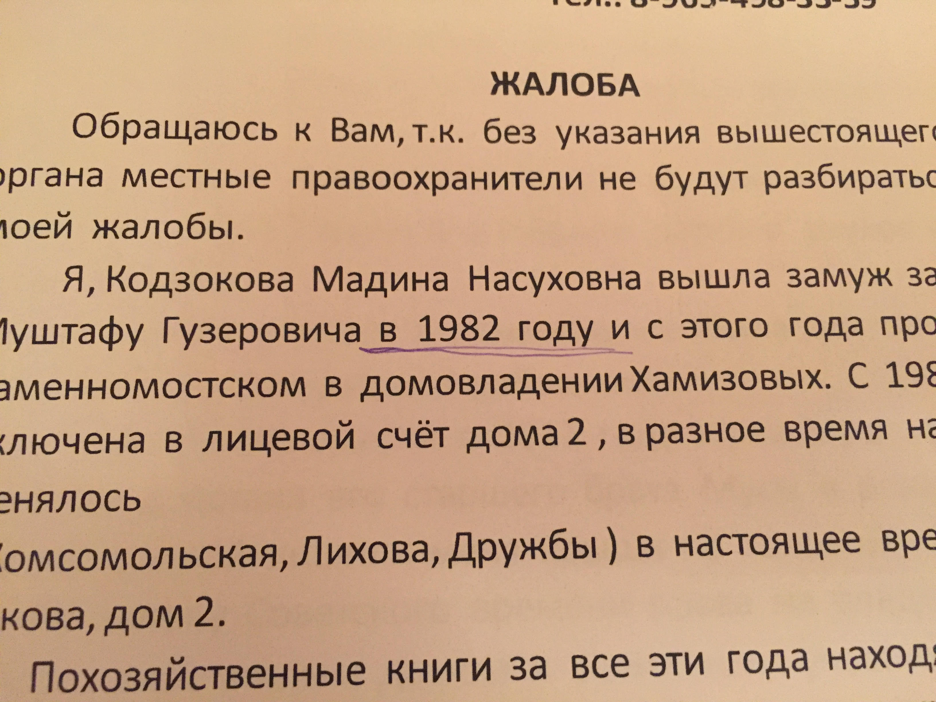 В 1990-м году во дворе уже имеющегося дома 1961 года постройки, Мадина с мужем возвели себе отдельный дом. В 2011 году у мужа случился инфаркт, он перенес операцию по шунтированию сосудов сердца. А через год умер. Сразу же после смерти мужа, его брат, который живет в Нальчике и имеет квартиру, начал предпринимать действия, чтобы выселить невестку из домовладения, в котором та прожила 30 лет. При этом у Мадины нет ни другого жилья, ни близких родственников, которые могли бы ее приютить.
