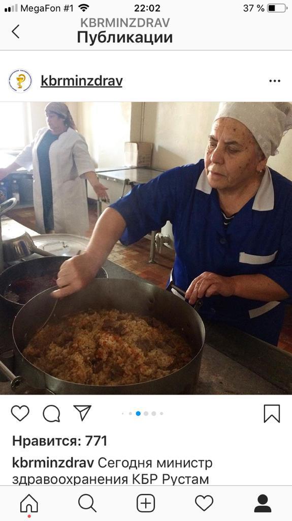 На проверку в Зольскую ЦРБ выехал министр здравоохранения Рустам Калибатов лично. Министр начал обход с пищеблока, где для больных был приготовлен обед: борщ и плов, а также поговорил с пациентами и врачами, - пишет Минздрав на своей странице в Инстаграме.
