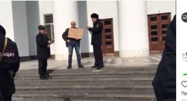 Силовики задержали двух активистов, проводивших у здания парламента Кабардино-Балкарии одиночные пикеты против поправок в Конституцию. Стоп-кадр видео Instagram https://www.instagram.com/p/B9oFM_EIVeu/