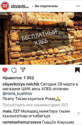 Нальчанин Роман Кушхов оплатил весь хлеб, который имелся в продаже в магазине «Шик», чтобы посетители магазина могли его взять бесплатно. А торговый центр «Горный» часть выпеченного в собственной пекарне хлеба ежедневно раздает бесплатно.