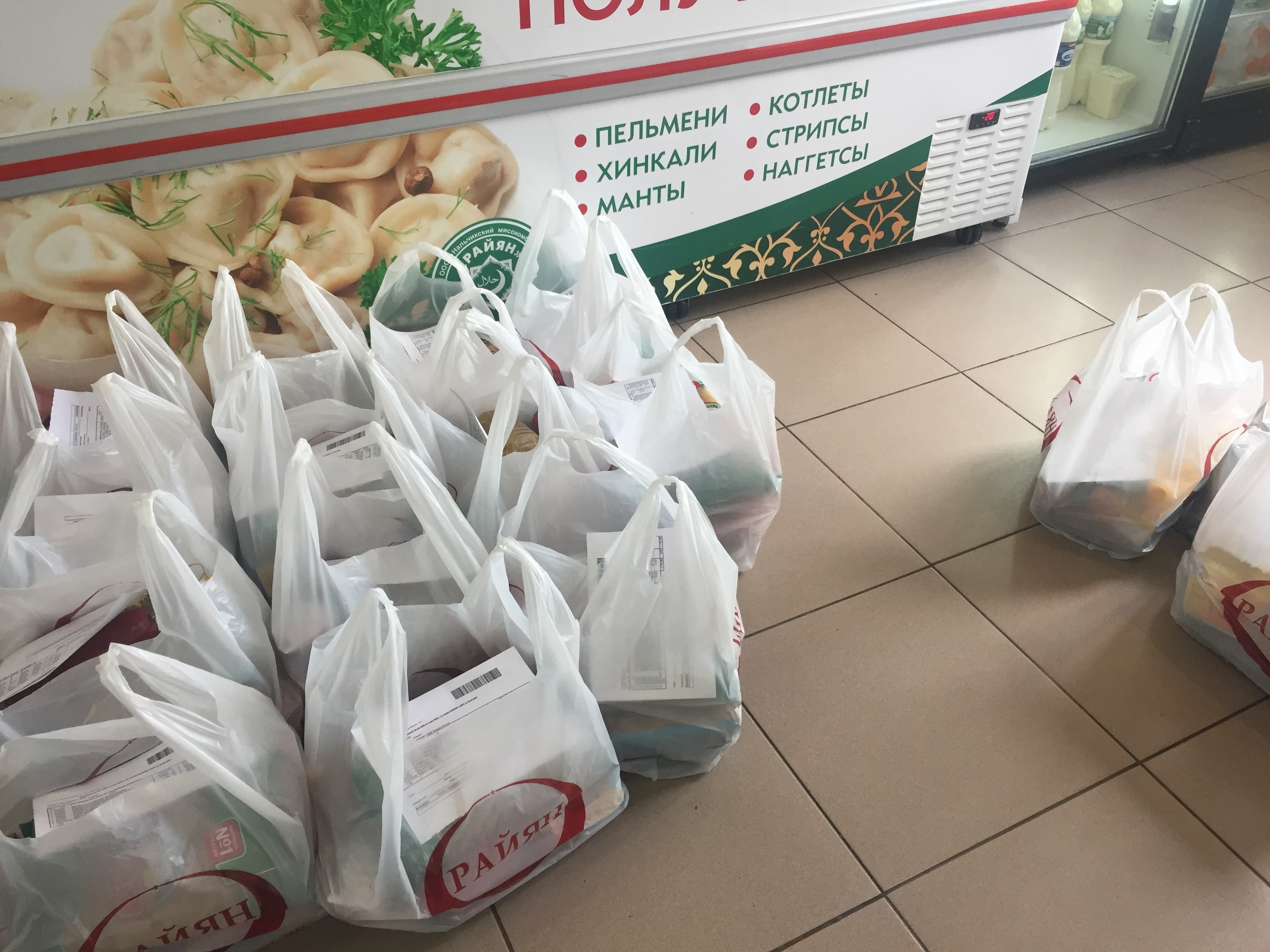 Я с разрешения рассмотрела содержимое одного пакета. В нем было мясо, курятина, колбаса, сосиски – все из серии «Халяль». В пакете также была бутылка растительного масла, макароны, финики.