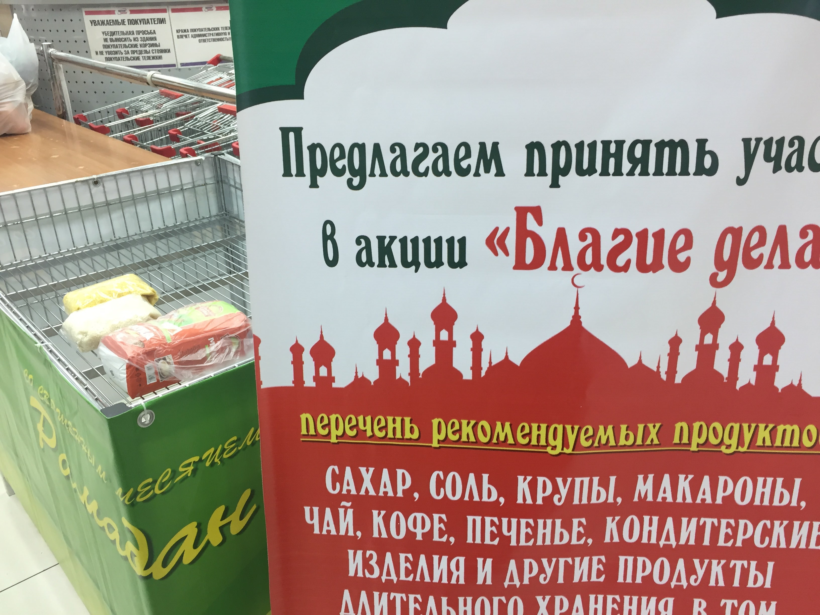 В магазине «Вестер-Гипер» в связи с Рамаданом организована «Акция добра». На входе в отдел установлена корзина, куда желающие складывают продукты. Любой нуждающийся может забрать оттуда все, что ему нужно. В магазине мне рассказали, что в первый день акции корзину заполнил директор магазина.