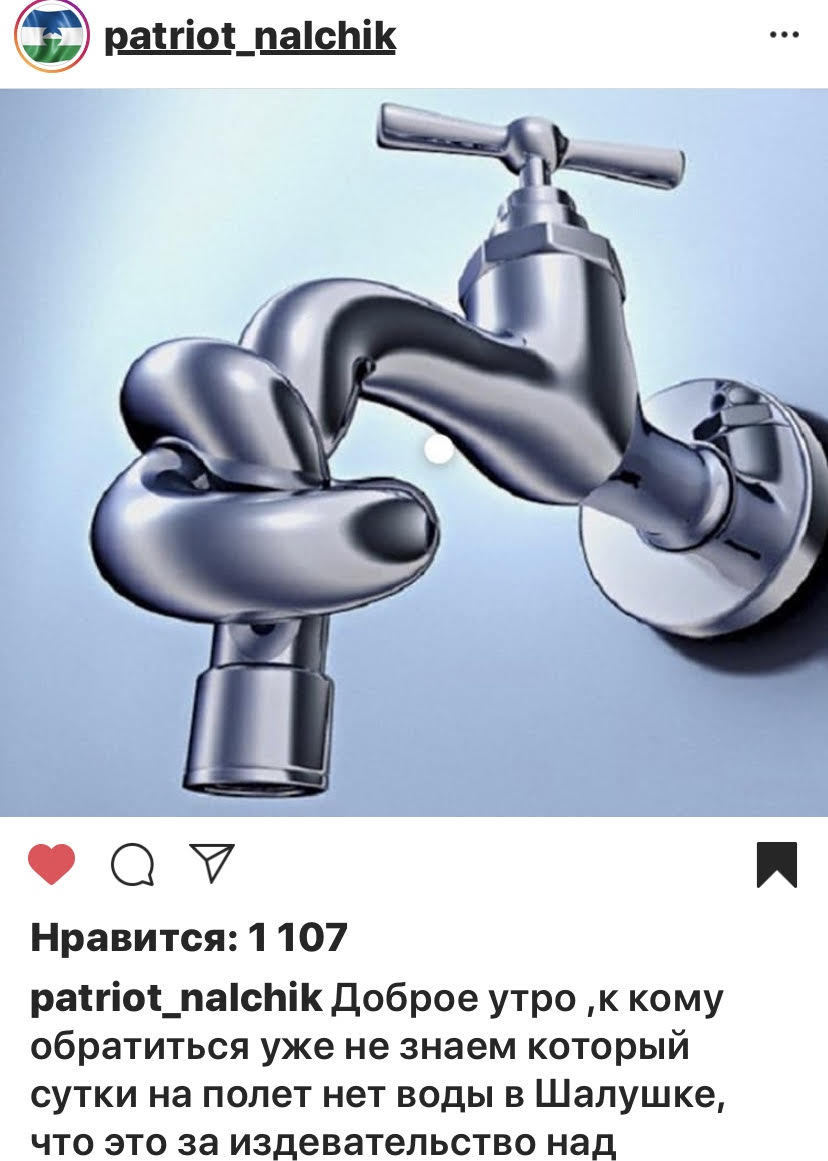 Уже несколько дней в группе «Патриот.Нальчик», а также в «КБР.Оъявления» в Инстаграме жители многих сел Кабардино-Баокарии сообщают о полном отсутствие воды в населенных пунктах республики. Люди рассказывают о своих ситуациях в надежде, что их кто-то услышит и решит проблему.