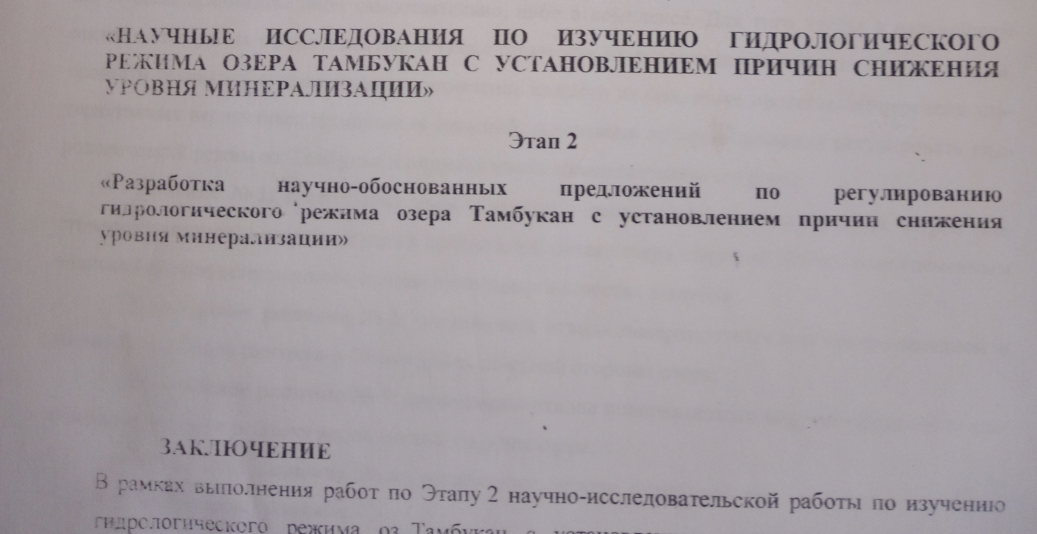 Эта цитата взята из отчета «Научные исследования по изучению гидрологического режима озера Тамбукан с установлением причин снижения уровня минерализации», подготовленный ВНИИ Институт гидротехники имени Б.Е. Веденеева.
