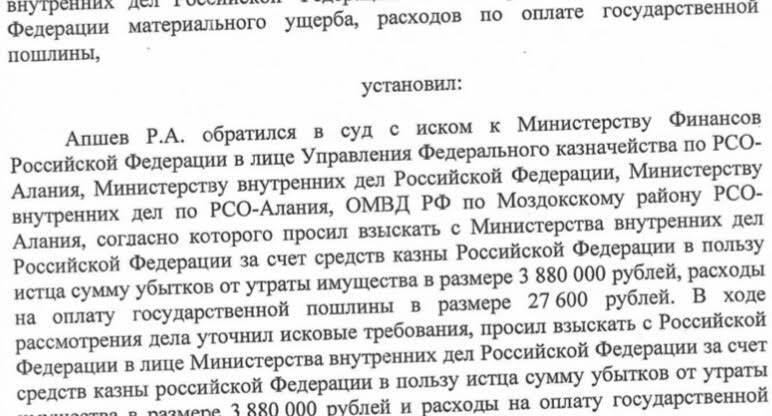 Суд первой инстанции и апелляционный суд РСО- Алании отказали ему в удовлетворении иска, который он адресовал МВД России, и его структурам в РСО-Алании, ибо автомобиль у него забрал дознаватель Моздокского РОВД.