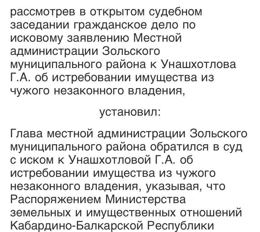 В 2016 году Администрация Зольского района обратилась в суд с иском об изъятии у нее квартир на том основании, что общежитие признано нежилым помещением, и что ответчица проживает там незаконно. Администрация исходила из того факта, что здание общежития сначала находилось в республиканской собственности, а затем было передано в муниципальную. Однако, суды и первой и второй инстанций подтвердили законность проживания Унашхотловой.