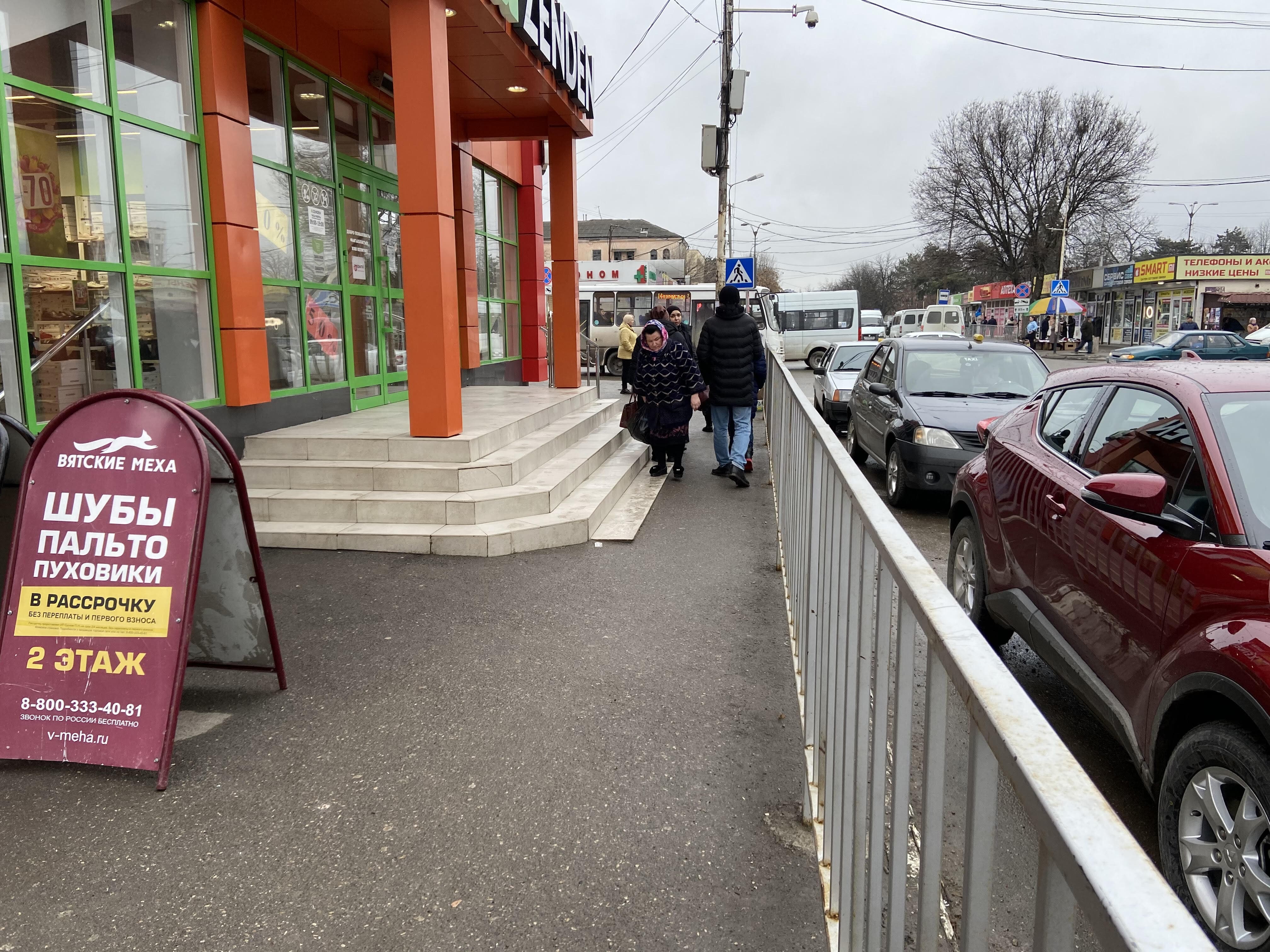Например, в районе Зеленого рынка, на углу улиц Пачева и Ахохова, к зданию торгового центра «Зенден» сооружены ступеньки, которые заняли весь тротуар. Не понятно чем и какими правилами руководствовались лица, соорудившие эти ступеньки. В магазин имеются два входа - со стороны обеих улиц. Ступеньки выдвинуты больше чем на половину тротуара, так что два человека не смогут разминуться - один из них должен подняться на ступеньки и идти по ним. А, между тем, это место, самое оживленное место в городе.