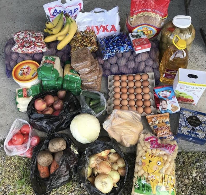 А наборы продуктов у них самые щедрые – здесь и продукты первой необходимости по 5 кг, фрукты, овощи, сладости, яйца, а также мясо или курица.