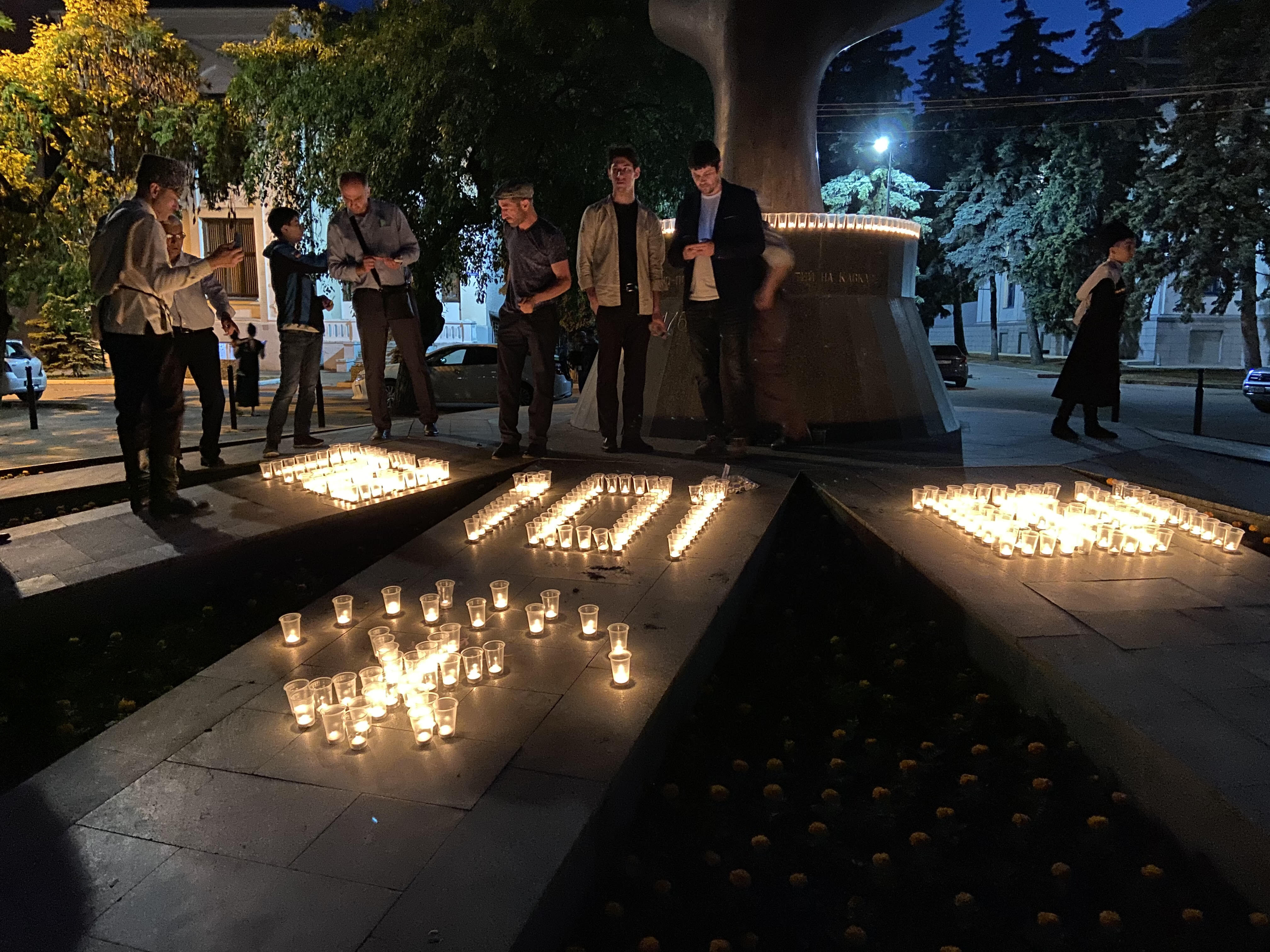 Сегодня вечером, 20 мая, у памятника «Древо жизни» состоялась акция «101 свеча». Именно столько лет продолжалась Русско-Кавказская война. Представители адыгской молодежи выложили из свечей памятную дату – «1763-1864», «101» и черкесский флаг.