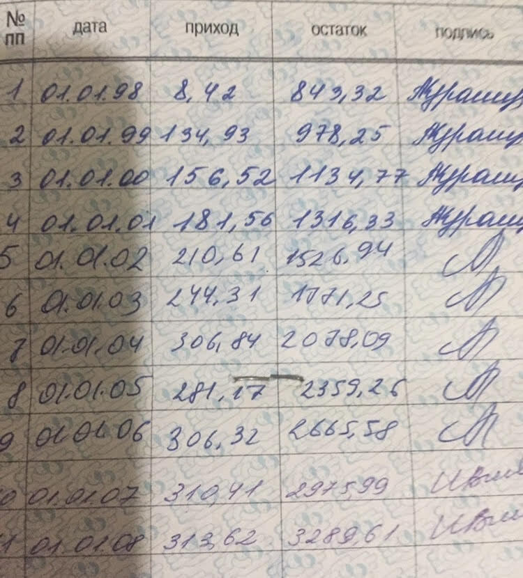Жанна Карова из Нарткалы рассказала, что именное свидетельство ей вручили в 1998 году на имя дочери, которой уже 24 года. Жанна ходила с ним каждый год и в свидетельстве делали записи, в нем 11 записей за каждый год, на счету 3289 рублей 61 копейка. Сначала проценты начислялись в Детском фонде, а две последние записи сделаны в Минтруда, там же потом заявили, что больше не надо приходить.