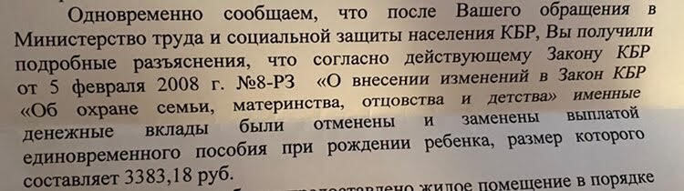 Законом КБР от 5 февраля 2008 года №8-РЗ «О внесении изменений в Закон КБР «Об охране семьи, материнства, отцовства и детства» именные денежные вклады были отменены и заменены выплатой единовременного пособия при рождении ребенка в размере 3383,18 рублей. При этом накопившиеся суммы не были выплачены обладателям именных вкладов. Вот по этому поводу периодически b возникают вопросы.