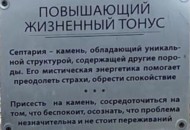 "Недавно проходила мимо, камни прекрасные как украшение улицы, но таблички над ними рассмешили. Из табличек следует, что камни помогают расслабиться, исполняют желания... При этом на одном из камней сидела девушка, свесив ноги, и закрыв глаза, что-то шептала.. К камням у меня претензий нет, претензии к людям, которые верят в их «волшебную силу».