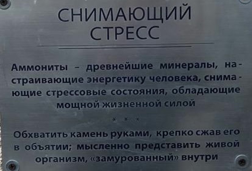Прочитав этот комментарий, я вспомнила надписи на табличках, установленных возле каждого из камней. Они сообщают, что камни обладают "мистической энергетикой", целебными свойствами, снимают стресс, повышают жизненный тонус и т.д. Например, аммониты названы "Снимающие стресс", здесь рекомендуется "Обхватить камень руками, крепко сжав его в объятиях, мысленно представить живой организм, "замурованный" внутри". Еще один камень назван "Очищающий организм". Здесь надо "сесть на камень, как на стул, опереться двумя руками, попытавшись стать с ним единым целым".