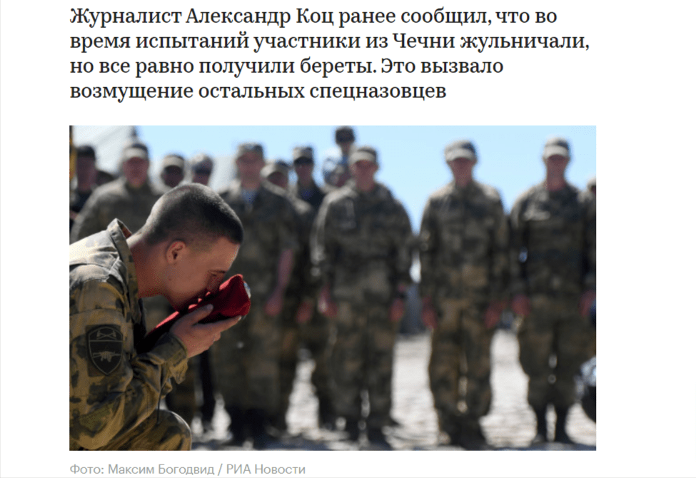 Практически уверен, что возмущение той части российских военнослужащих, которые пишут ксенофобные комментарии в соцсетях, вызваны их шовинистическим естеством: как же это так получается, что “чехи”, которых мы еще вчера убивали, сегодня с нами соревнуются как боевые товарищи и претендуют на краповый берет? Понятное дело, что такие люди не видят “бородатых чеченов” своими боевыми товарищами, хоть они и служат одному режиму.