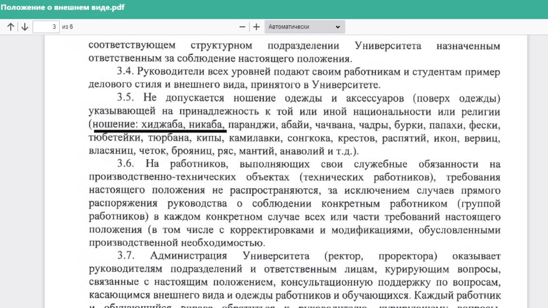 Этот документ опубликован на сайте университета. Кроме дискриминационного запрета хиджаба, в этом положении есть еще много других эпизодов откровенной дискриминации гражданина и вторжение в личную жизнь человека. Так, университет запрещает своим сотрудникам и студентам ношение юбки ниже 20 см от колен, а студентам ношение “не консервативной бороды”. В то же время, университет “не рекомендует” чересчур облегающие декольте, прозрачные блузки и другие откровенные формы одежды. Чувствуете разницу между “запретом” и “не рекомендуется”?