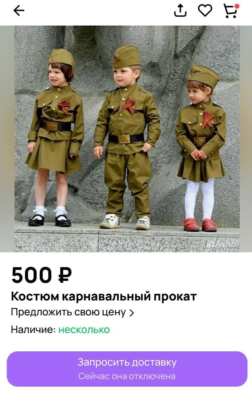 Прокат такого костюма обойдётся родителям в 500 рублей, покупка в 2000 рублей. А находится такой костюм солдата ВОВ по запросу "карнавальный костюм" 🤯:
