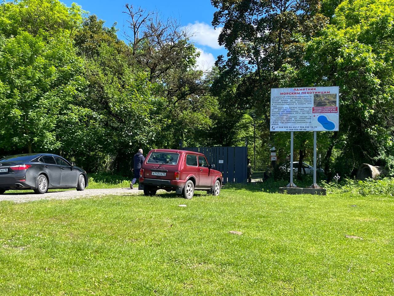 Как так вышло вообще не понятно. Раньше территория рядом была государственной, тут была турбаза - огромное пространство с озером и лесными насаждениями. Сейчас, как рассказали местные, всем этим владеет сын директора той государственной базы. Там убрали беседки, построили симпатичную дачу, в озере плавают уточки, по газону гуляют белые гуси, а закрывает это всё высокий забор. Чтобы подойти к памятнику, можно позвонить по номеру, указанному на баннере у ворот и вас любезно пустят. Желающих вряд ли сильно много, не думаю, что владельца часто беспокоят, все уже, кажется, забыли о том, что вообще был там какой-то памятник.