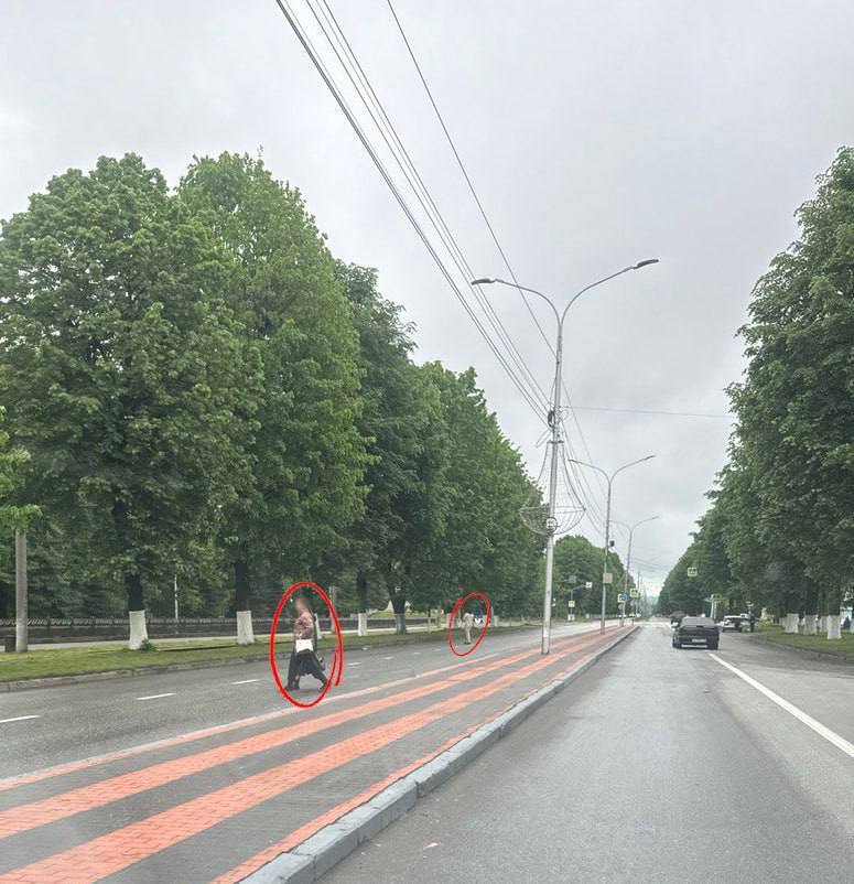 На этой же полосе рядышком решили вовсе избавиться от зелени и уложили покрашенный в цвета георгиевской ленты щебень. Щебень посреди дороги, конечно, не такой капризный как гортензии, но это решение тоже не протянуло сезона. Поэтому щебень заменили на плиты в тех же цветах. Наконец, на радость благоустроителям тут точно ничего не прорастёт. Однако, появилась новая проблема - нерадивые пешеходы перебегают дорогу и наступают ногами на государственный символ воинской славы. Звучит нехорошо, скажет кто-то, звучит как новый тендер, скажу я.
