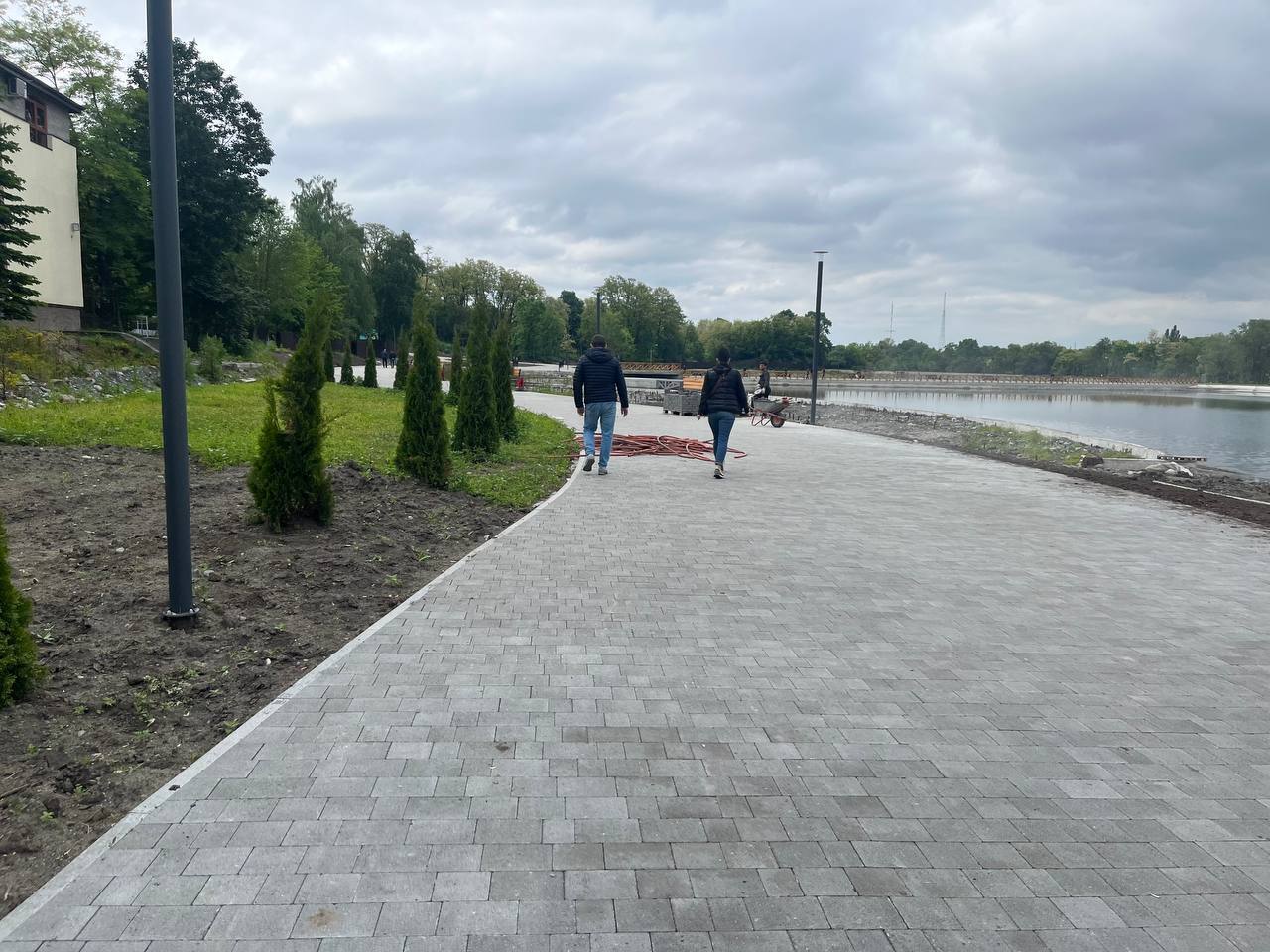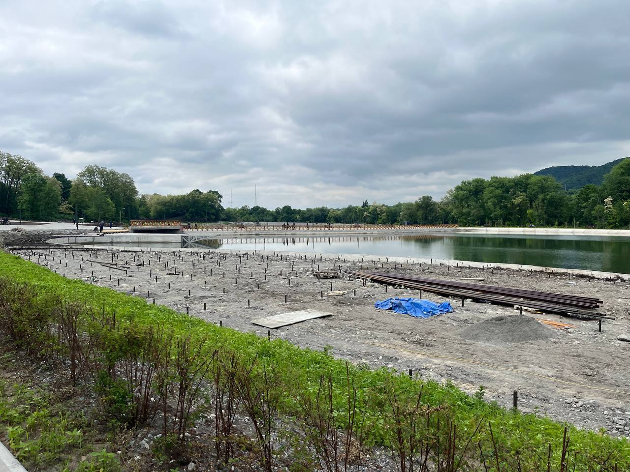 Да, до этого были дорожки узковаты тут, но как-то знаете ли помещались все. Теперь тут почти проспекты из плитки. Всё было бы неплохо, если бы они не были разбиты за счёт уменьшения озера. Между двумя озерами так вообще появилось вот такое большое пространство. Судя по тому, что в планах тут аж два кафе, это, видимо, место под него. Только вот кафе у нас и так очень много в городе, а водоёмов для купания нет. Так зачем лишать его жителей ради очередного общепита не понятно.