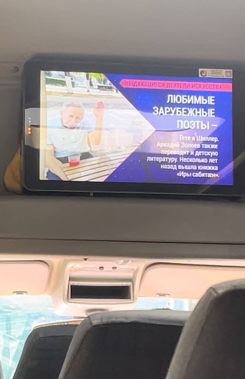 Справедливости ради хочу ещё упомянуть, что не все городские маршрутки в таком состоянии, как я описывала в прошлом посте. Попадаются и новые чистенькие экземпляры. Редко сейчас езжу на автобусах, чаще на трамвае, может, это уже давно так, но я впервые увидела внутри маршрутки такой информационный экран. Помимо рекламы там показывали слайды об интересных людях и об истории города. Пока ехала успела посмотреть про театры Владикавказа.