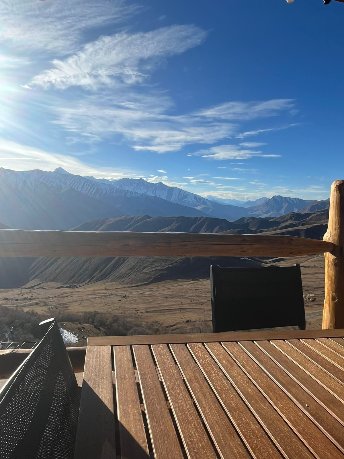 Панорама на перевале невероятно живописная, здесь очень большой обзор на Кавказский хребет, хорошо виден Казбек. Погода была ясная и безветренная. Обстановка располагала к философским мыслям, но после подъема на Эрзи, усталости от серпантинов и сытного обеда думать было лень. Вспоминался только фрагмент из рассказа - недавно перечитала кавказский цикл Толстого и, глядя на этот вид, в голове всплыли мысли юнкера из рассказа Набег, который впервые приехал ка "Капказ", чтобы участвовать в сражении с "немирными горцами", и был поражён здешней природой: