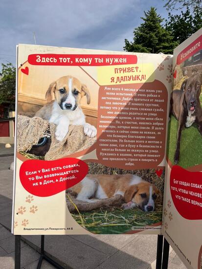 второе - в центре города прошла уличная выставка с фотографиями животных из приюта. У каждого животного своя грустная история, которую можно узнать и, собственно, сделать конец этой истории счастливым. Удачная, на мой взгляд, попытка привить людям мысль, что питомца можно взять из приюта и он не обязательно должен быть трендовой породы.