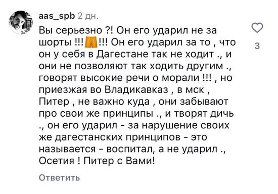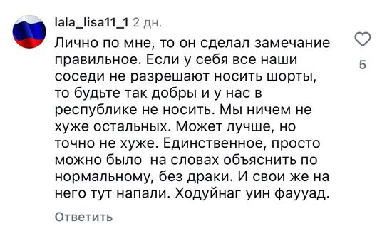 Реакция на само нападение и последующее извинение была любопытной, как обычно. Когда-то эти комментарии точно войдут в чью-то научную работу с названием типа "Социокультурный анализ конфликтов в контексте скандалов, связанных с шортами на Северном Кавказ".