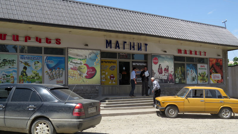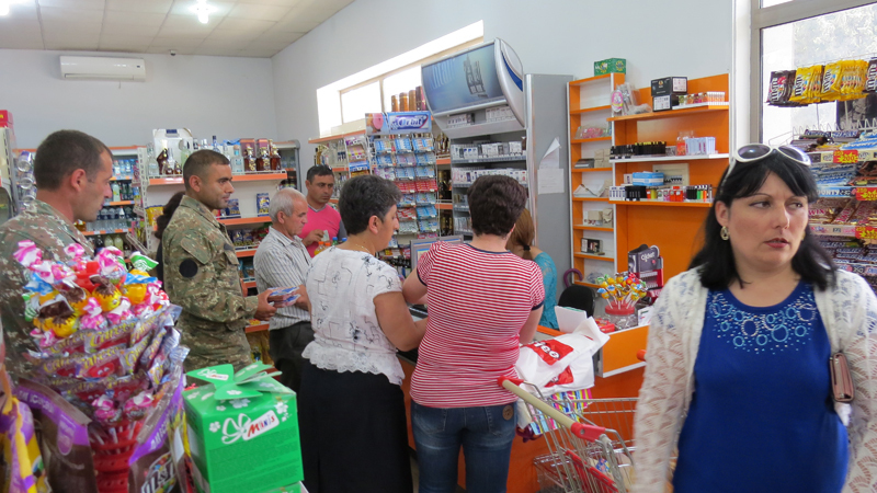 Попрощавшись с мэром Мартакерта, и отказавшись от его предложения «выпить чашку чая», я решил самому проехать по улицам города, поговорить с жителями. Зашёл в маркет «Магнит», чтобы купить сигареты и опешил... перед кассой стояла очередь, люди покупали продукты, виделись люди в военной форме. Пройдясь по прилавкам, я не увидел ни одного просроченного товара…