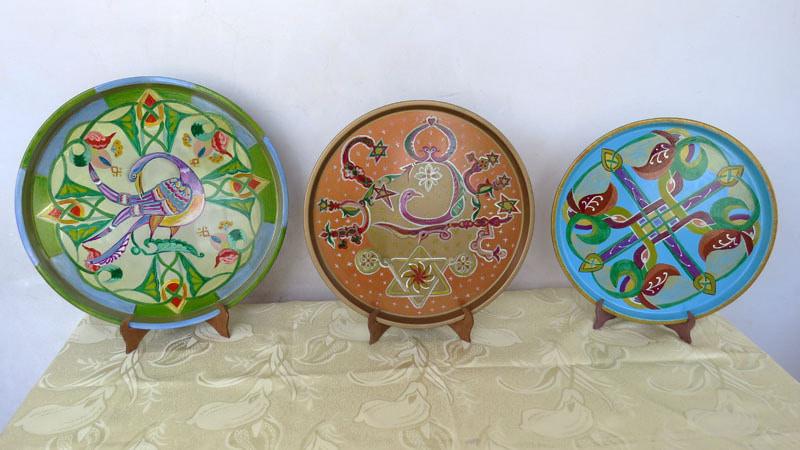 Поднос в середине: здесь росписными буквами армянского алфавита, взятые как заглавные, написано слово АРЦАХ. А внизу под словом орнамент камня надгробия Гасан-Джалала Великого князя Хачена. Композиция произвольная, как и цвет. Применены акриловые краски и после высыхания покрыты лаком.