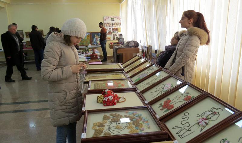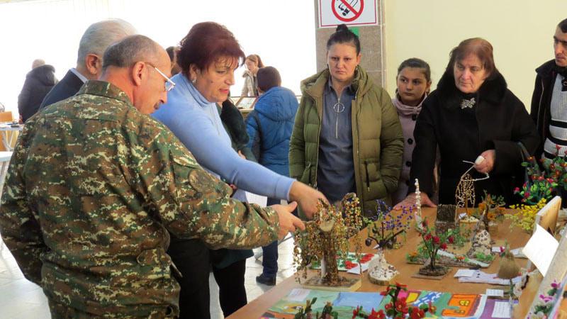 Аветисян Аделина, жена военнослужащего, на переднем плане, показывает свои работы.