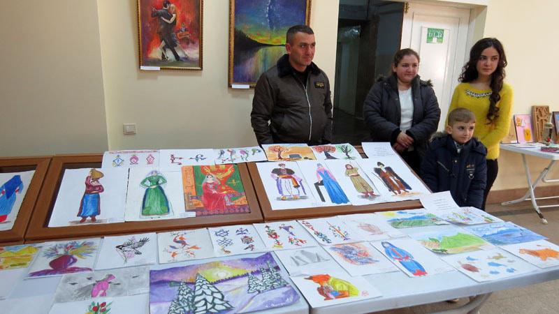 Лариса Давидян, жена военнослужащего с дочкой Маргаритой (8 лет) и Марианной (4 года) из с.Шош Аскеранского района рядом со своими работами.