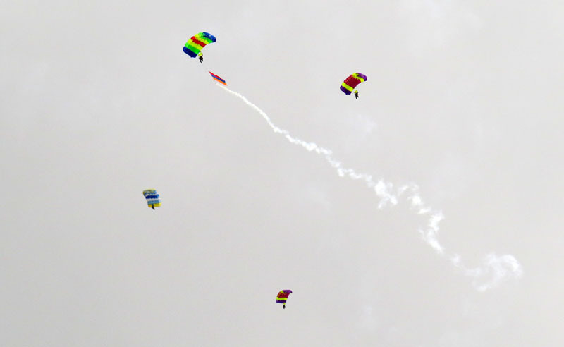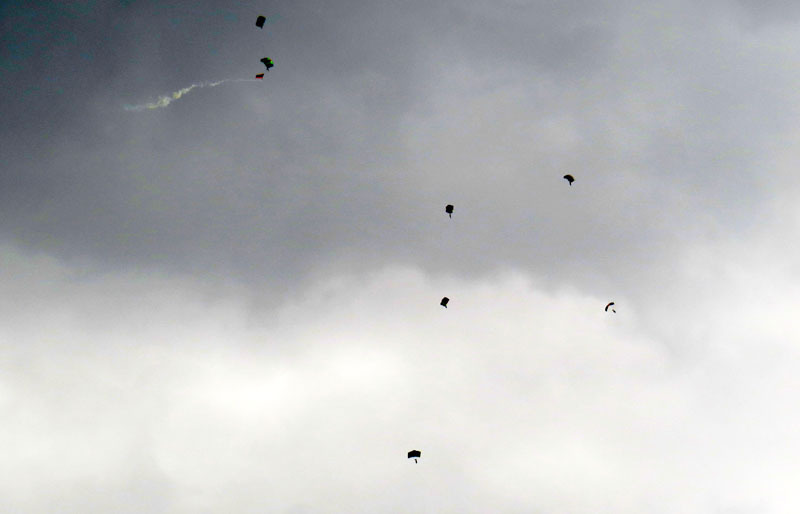 Хотя пошёл сильный дождь, а потом стало моросить, никто из зрителей не ушёл, все ждали... байкеров и парашютистов. И те не заставили себя долго ждать: высоко в небо поднялся военный вертолёт и от него начали отделяться маленькие фигурки парашютистов, которые, через некоторое время, резко качнулись в воздухе и над ними раскрылись разноцветные купола...