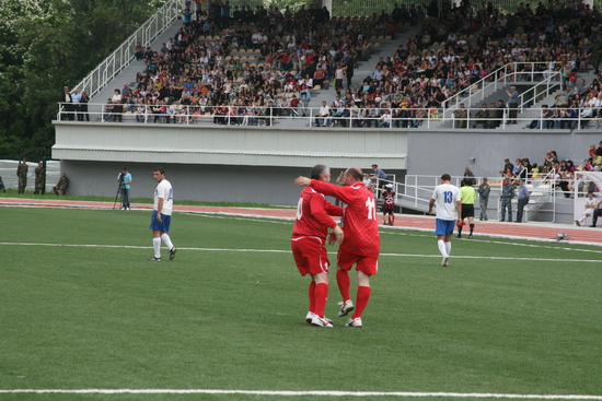 попал на открытие стадиона в Цхинвале, названного в честь Гурама Цховребова. стадион маленький, пятитысячник, но очень уютный, в окружении зелени. отстроен за счет Алишера Усманова. было официальное открытие, потом матч "сборных Южной Осетии и Абхазии", а потом продолжительный концерт. понятно, что звездой открытия был Кокойты, его было очень много. не знаю, может цхинвальцы скаучают по своему президенту, но по мне его было чересчур много. не знаю сколько раз он брал в руки микрофон, но столько говорить невозможно... одно лишь награждение после матча всех и всем длилось наверно почти час, как это возможно? в общем, Эдуард Кокойты устроил себе отличную пиар-компанию, не приложив к этому никаких усилий. порадовало другое - абсолютно свободная открытая атмосфера, никаких проверок при входе на стадион, да и на стадионе никаких ограничений передвижения, ни журналистам ни простым людям. не успел закончитсья матч, как на стадион повалили дети гонять мяч. Кокойты был абсолютно доступен, но я не знаю у кого могло возникнуть желание взять у него интервью после того как он час сотрясал воздух над стадионом своими пафосными речами. дальше фотографии, с небольшими комменатриями.