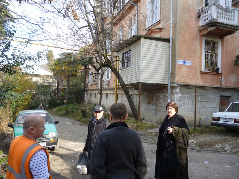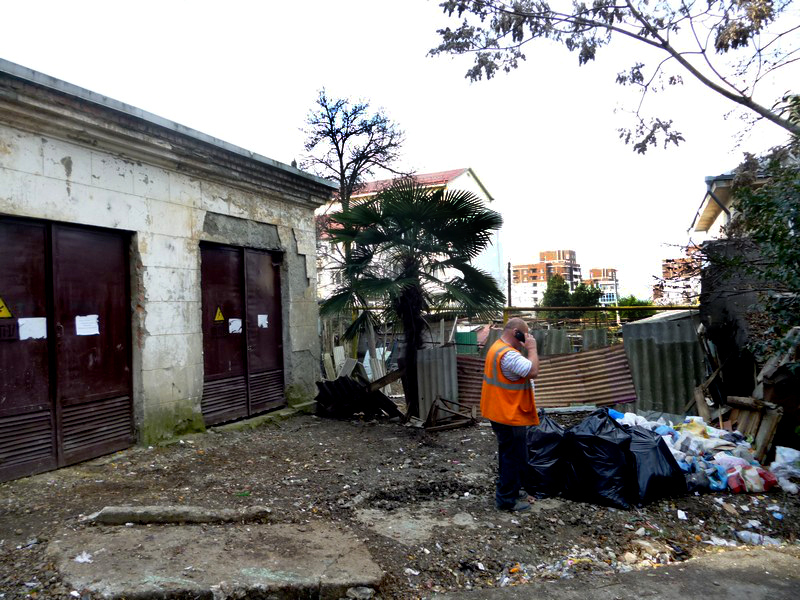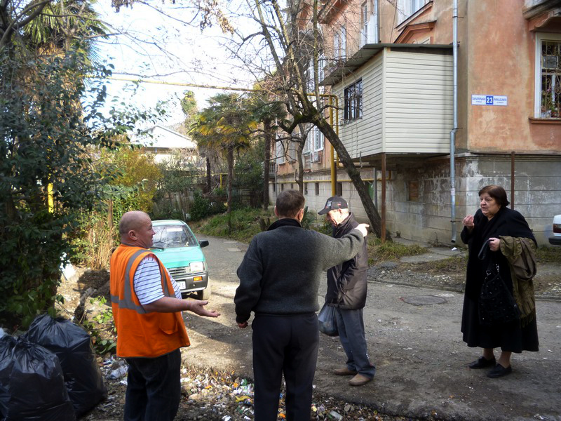 Жители домов, увидев, что площадка для мусора расчищена от свалки, спрашивают сотрудника САХа, куда им выбрасывать мусор?