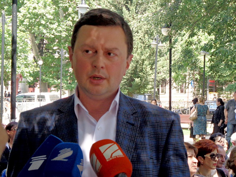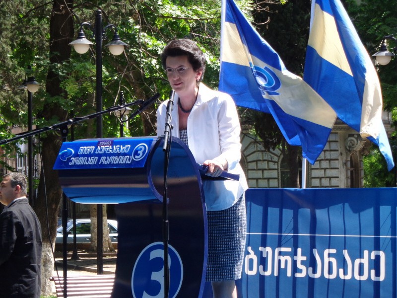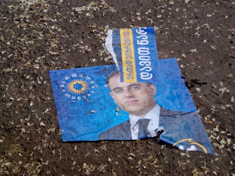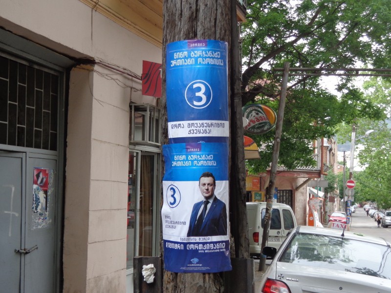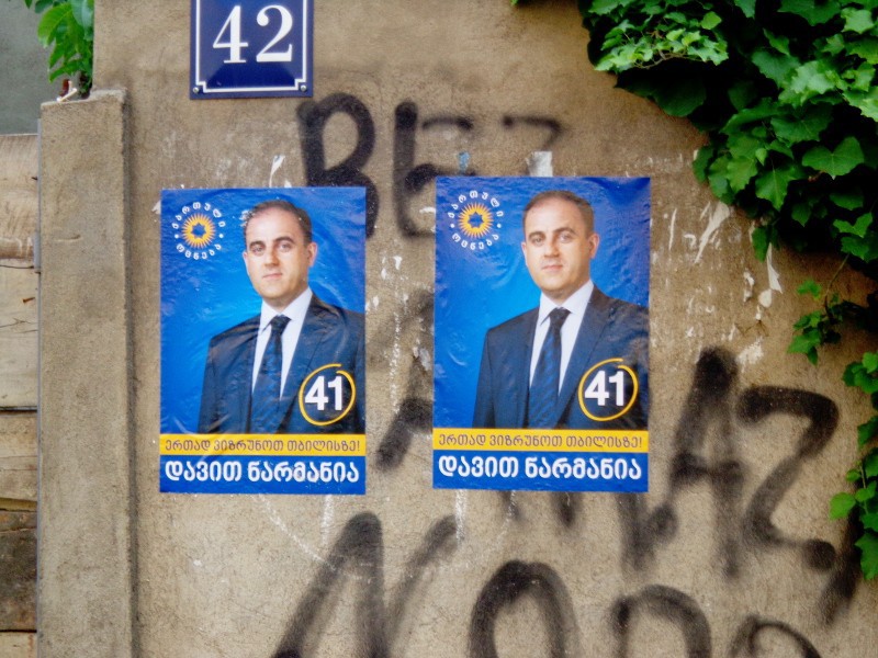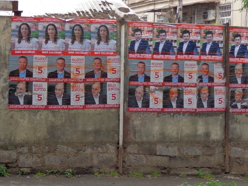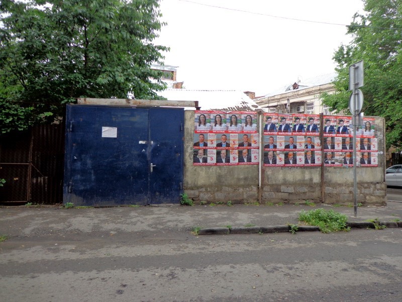 На заборе частного дома вывешены агитационные плакаты кандидатов в мэры Тбилиси и в мажоритарные депутаты Чугуретского избирательного округа