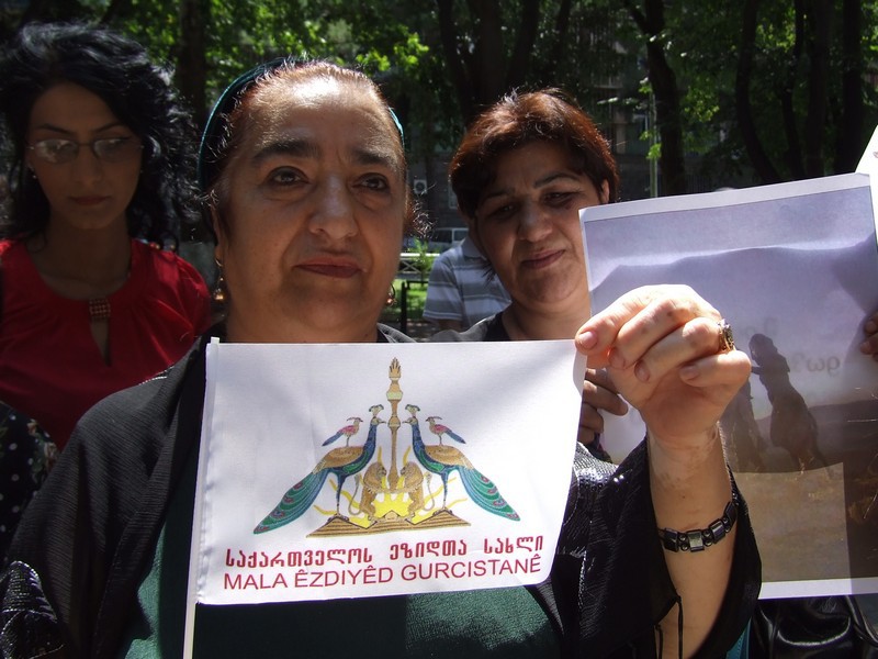 Участница митинга держит флажок с символикой и надписью "Дом езидов Грузии".