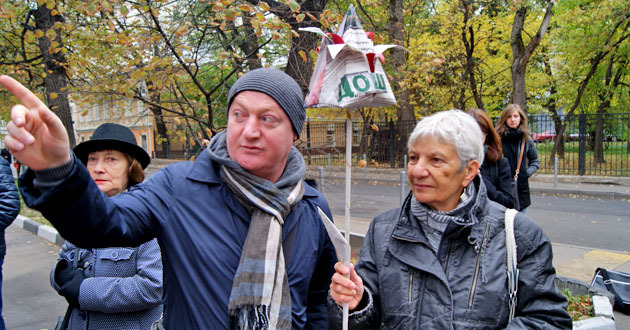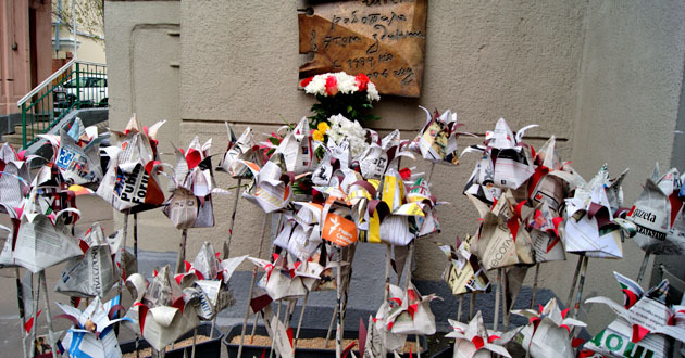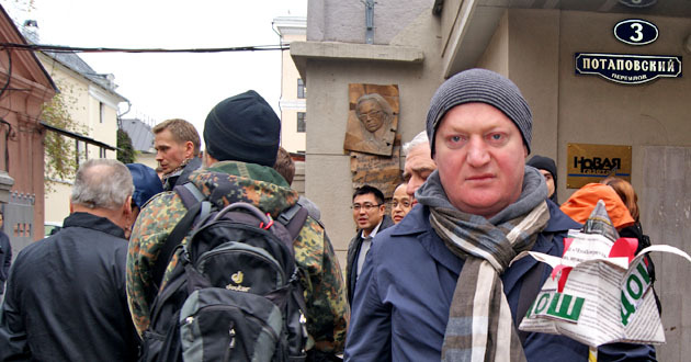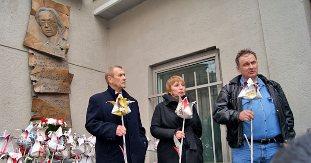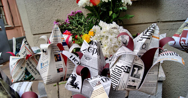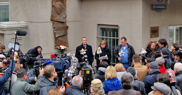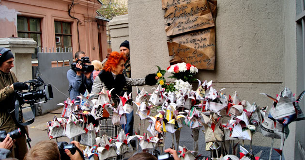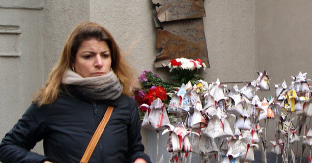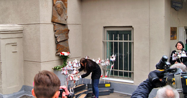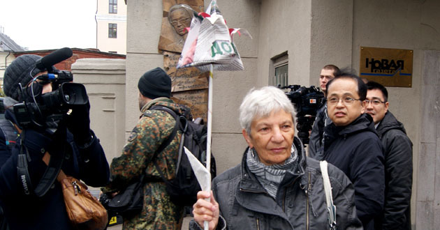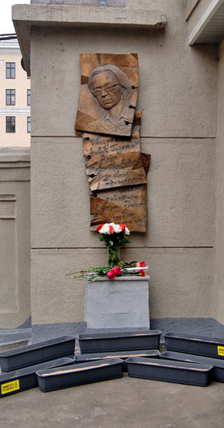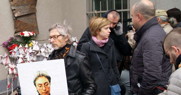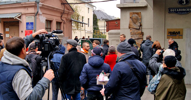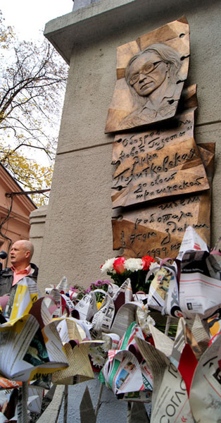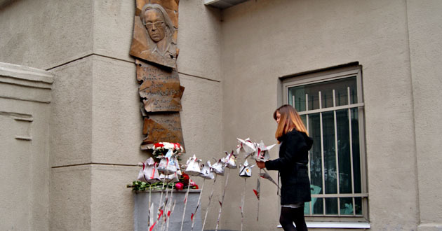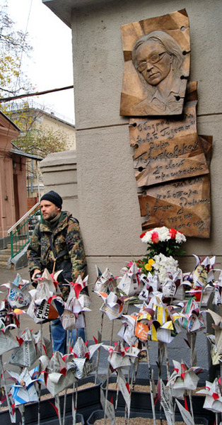 Возложение бумажных цветов к мемориальной доске Анны Политковской. Москва, 7 октября 2014 г. Фоторепортаж корреспондента "Кавказского узла" Аиды Магомедовой